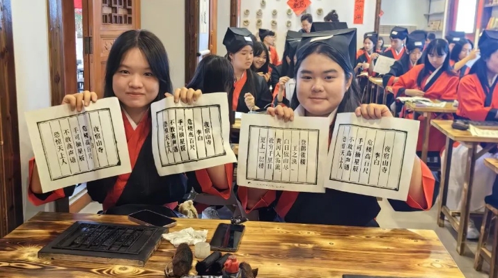 在河口古鎮(zhèn)的國學(xué)活字印刷研學(xué)館,港澳青少年們親自動手體驗(yàn)了古代的活字印刷術(shù)。他們小心翼翼地?cái)[放著字模,用墨汁輕輕刷過,再將宣紙覆蓋其上,輕輕一壓,一幅幅唐詩便躍然紙上。他們齊聲用粵語朗誦了“憫農(nóng)”“春曉”“相思”等經(jīng)典唐詩,不僅領(lǐng)略了民間藝術(shù)的獨(dú)特魅力,更在實(shí)踐中感受到了中華文化的博大精深。