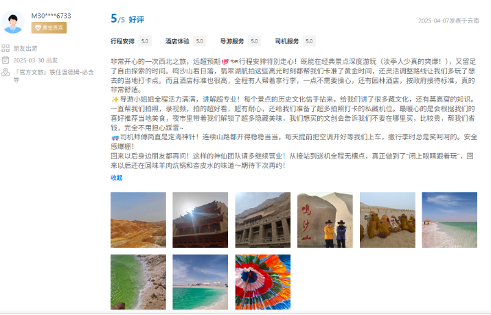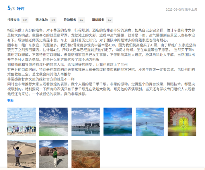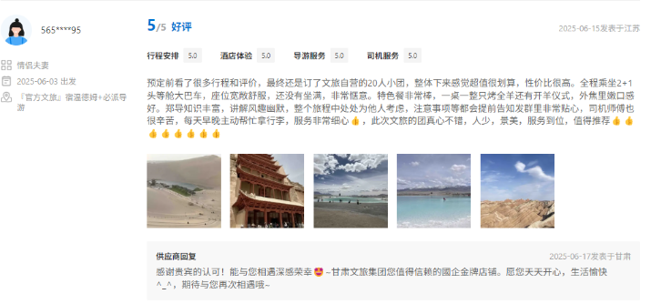 文旅國(guó)旅深度整合甘青兩地的經(jīng)典與小眾旅游資源,精心打造、上線行程豐富、體驗(yàn)舒適產(chǎn)品的同時(shí)南京運(yùn)營(yíng)中心緊密?chē)@游客核心需求,協(xié)同配備金牌工作人員隨團(tuán)提供專(zhuān)業(yè)講解與服務(wù),獲得廣泛好評(píng)。平臺(tái)數(shù)據(jù)顯示,近半年以來(lái),其攜程店鋪訂單量同比增長(zhǎng)超過(guò)40%,訂單完成率高達(dá)98.5%,展現(xiàn)出高度的市場(chǎng)認(rèn)可與出色的運(yùn)營(yíng)效能。用戶(hù)口碑方面,店鋪好評(píng)率持續(xù)穩(wěn)步提升,目前已達(dá)4.9分,累計(jì)精選好評(píng)超千條,“質(zhì)量可信、服務(wù)可依”的品牌形象日益凸顯。