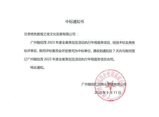 9月11日,在歷經(jīng)三輪的競(jìng)價(jià)談判,經(jīng)過層層篩選和激烈角逐,甘肅文旅集團(tuán)旗下甘肅文旅運(yùn)營(yíng)集團(tuán)子公司甘肅絕色敦煌之夜文化發(fā)展有限公司成功中標(biāo)廣州融創(chuàng)茂2023年度全案策劃及活動(dòng)執(zhí)行年框服務(wù)項(xiàng)目。