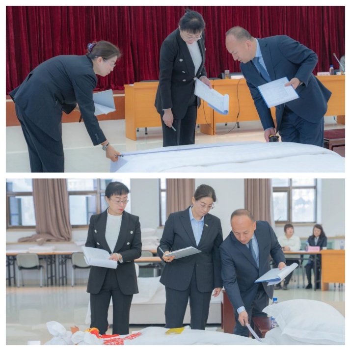 評(píng)委們認(rèn)真檢查選手做床完成情況,從鋪床準(zhǔn)備、操作規(guī)范等方面進(jìn)行綜合評(píng)判。